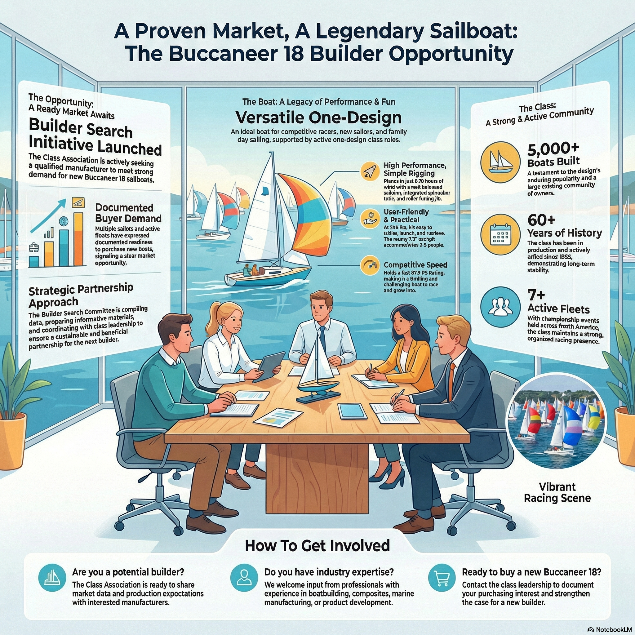 Building on a Strong Legacy. The Association is dedicated to identifying potential manufacturers to fulfill the strong interest from sailors wishing to join our class. This initiative is supported by the Buccaneer 18’s 60-year track record, which includes over 5,000 boats built and a robust community of more than 7 active fleets across North America